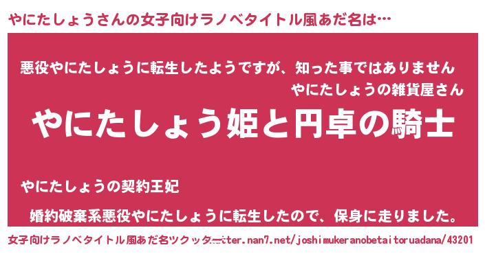 | 男性向けラノベタイトル風あだ名 | 『やにたしょうの憂鬱』 |