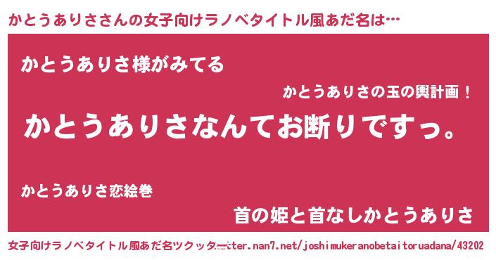 | 男性向けラノベタイトル風あだ名 | 『魔法科高校のかとうありさ』 |