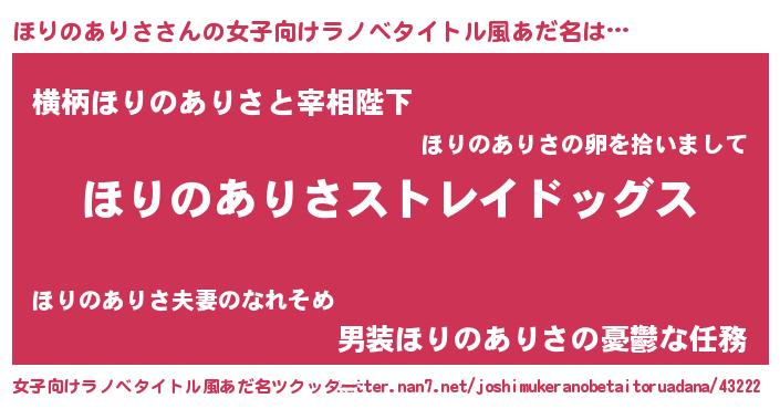 | 男性向けラノベタイトル風あだ名 | 『Re:ほりのありさから始める異世界生活』 |