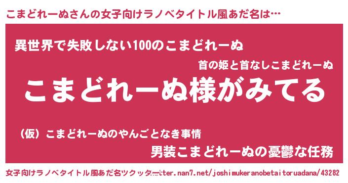 | 男性向けラノベタイトル風あだ名 | 『こまどれーぬの嫁は女の子じゃないと思った?』 |