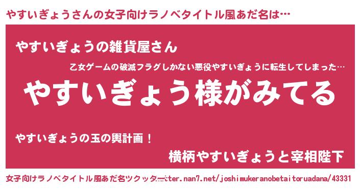 | 男性向けラノベタイトル風あだ名 | 『やすいぎょうの嫁は女の子じゃないと思った?』 |