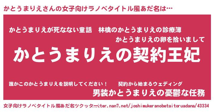 かとうまりえさんの女子向けラノベタイトル風あだ名は… 『かとうまりえの契約王妃』『かとうまりえが死なない童話 林檎のかとうまりえの診療簿』『男装かとうまりえの憂鬱な任務』 ツクッター #女子向けラノベタイトル風あだ名ツクッター http://tkutter.nan7.net/joshimukeranobetaitoruadana/43334/