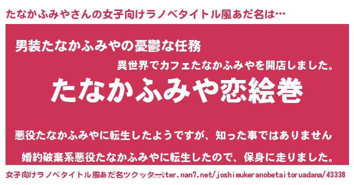| 男性向けラノベタイトル風あだ名 | 『おまえをオタクにしてやるから、俺をたなかふみやにしてくれ! 』 |