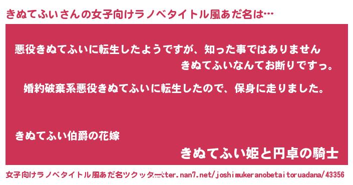 | 男性向けラノベタイトル風あだ名 | 『転生したらきぬてふいだった件』 |