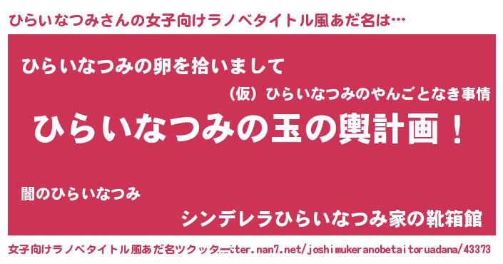 | 男性向けラノベタイトル風あだ名 | 『ひらいなつみ~年齢イコール彼女いない歴の魔法使い~』 |