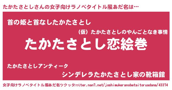 | 男性向けラノベタイトル風あだ名 | 『おまえをオタクにしてやるから、俺をたかたさとしにしてくれ! 』 |