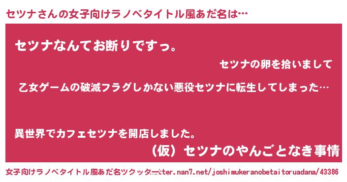 セツナさんの女子向けラノベタイトル風あだ名は… 『乙女ゲームの破滅フラグしかない悪役セツナに転生してしまった…』『セツナなんてお断りですっ。』『(仮)セツナのやんごとなき事情』 ツクッター #女子向けラノベタイトル風あだ名ツクッター http://tkutter.nan7.net/joshimukeranobetaitoruadana/43386/
