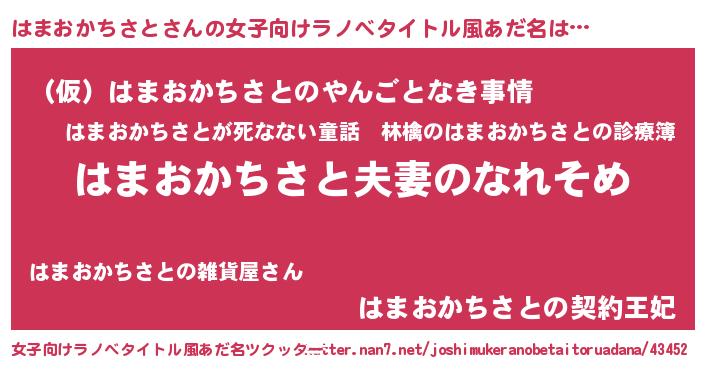 | 男性向けラノベタイトル風あだ名 | 『おまえをオタクにしてやるから、俺をはまおかちさとにしてくれ! 』 |