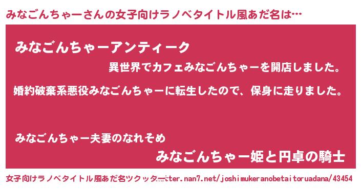 | 男性向けラノベタイトル風あだ名 | 『ミナゴンチャースレイヤー』 |