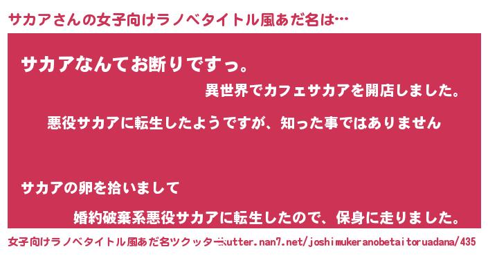 | 胡散臭い通販商品みたいなあだ名 | 『あなたにだけ特別に提供する100年もののヴィンテージワイン…その名も「サカア」』 |