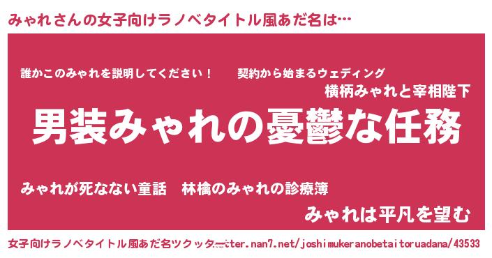 | 男性向けラノベタイトル風あだ名 | 『うちのみゃれが世界を掌握している!』 |