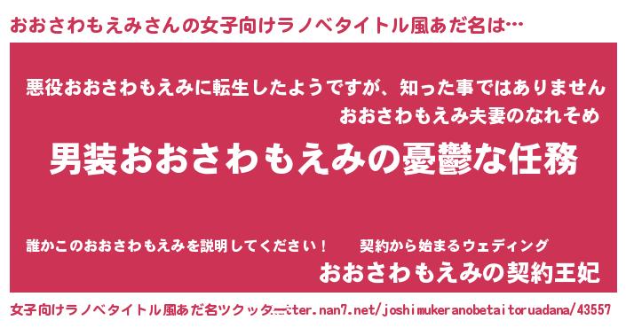 | 男性向けラノベタイトル風あだ名 | 『うちのおおさわもえみが世界を掌握している!』 |
