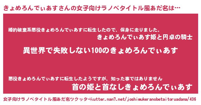 | 胡散臭い通販商品みたいなあだ名 | 『絶対に幸福をもたらす健康食品…その名も「きょめろんでぃあす」』 |