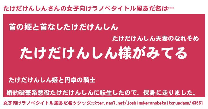| 男性向けラノベタイトル風あだ名 | 『たけだけんしんの嫁は女の子じゃないと思った?』 |