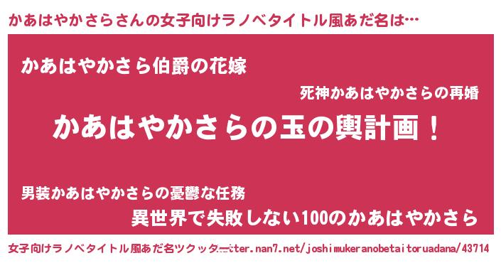 | 男性向けラノベタイトル風あだ名 | 『かあはやかさら~年齢イコール彼女いない歴の魔法使い~』 |