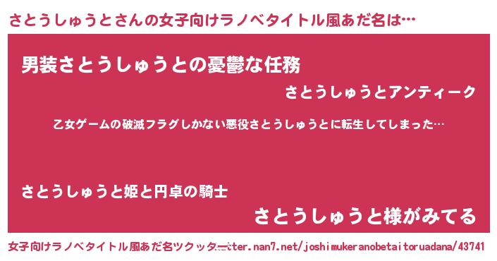 | 男性向けラノベタイトル風あだ名 | 『魔弾の王とさとうしゅうと』 |