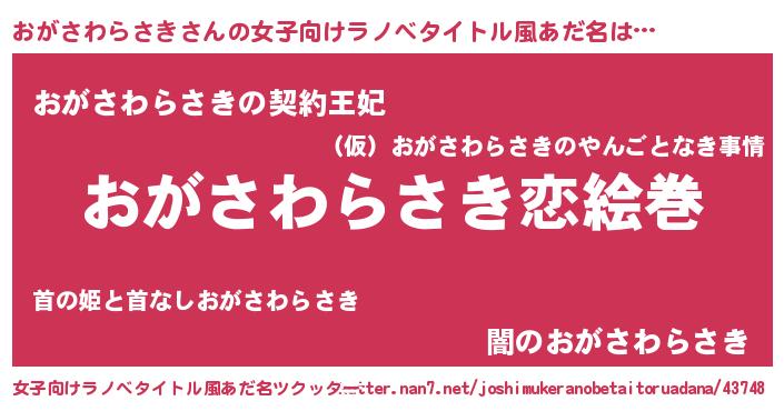 | 男性向けラノベタイトル風あだ名 | 『おまえをオタクにしてやるから、俺をおがさわらさきにしてくれ! 』 |