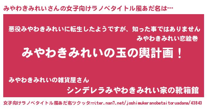 | 男性向けラノベタイトル風あだ名 | 『みやわきみれい~年齢イコール彼女いない歴の魔法使い~』 |