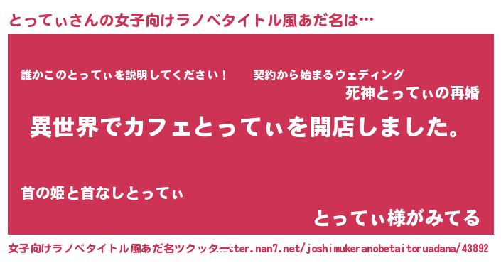 | 男性向けラノベタイトル風あだ名 | 『誰もが恐れるあのとってぃが、ぼくの専属メイドになるようです。』 |