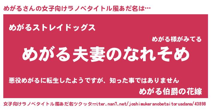 | 男性向けラノベタイトル風あだ名 | 『おまえをオタクにしてやるから、俺をめがるにしてくれ! 』 |