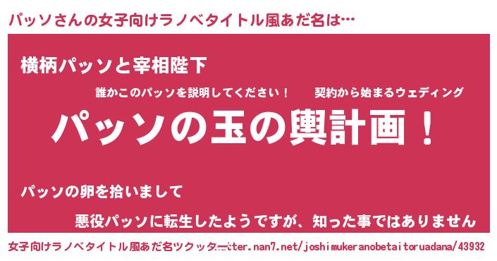 | 男性向けラノベタイトル風あだ名 | 『パッソ~年齢イコール彼女いない歴の魔法使い~』 |