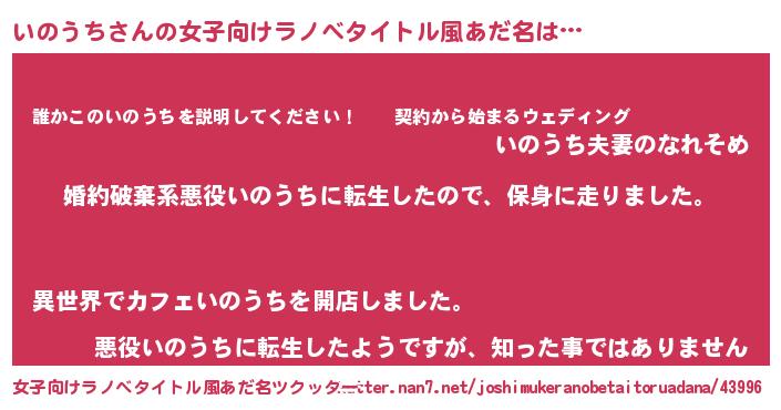 いのうちさんの女子向けラノベタイトル風あだ名は… 『婚約破棄系悪役いのうちに転生したので、保身に走りました。』『誰かこのいのうちを説明してください! ~契約から始まるウェディング~』『悪役いのうちに転生したようですが、知った事ではありません』 ツクッター #女子向けラノベタイトル風あだ名ツクッター http://tkutter.nan7.net/joshimukeranobetaitoruadana/43996/