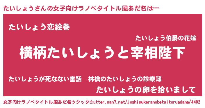| 男性向けラノベタイトル風あだ名 | 『たいしょうに滅ぼされるだけの簡単なお仕事です』 |