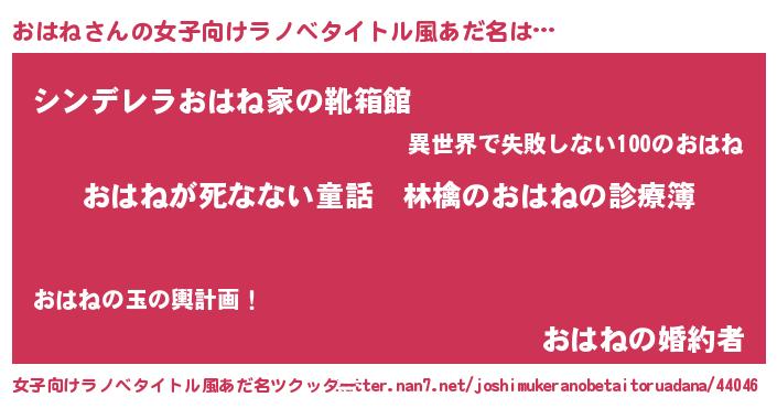 おはねさんの女子向けラノベタイトル風あだ名は… 『おはねが死なない童話 林檎のおはねの診療簿』『シンデレラおはね家の靴箱館』『おはねの婚約者』 ツクッター #女子向けラノベタイトル風あだ名ツクッター http://tkutter.nan7.net/joshimukeranobetaitoruadana/44046/