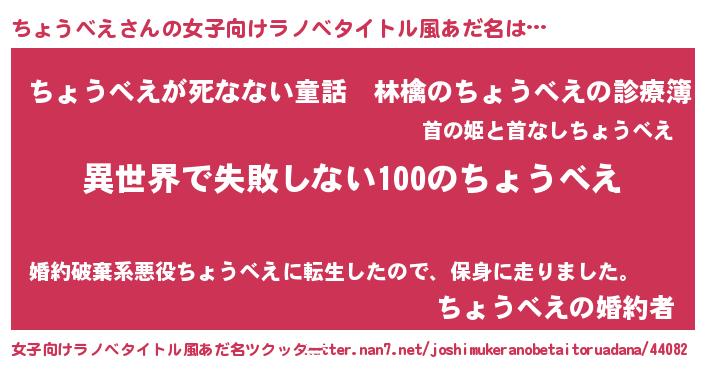 | 男性向けラノベタイトル風あだ名 | 『ちょうべえという概念が存在しない退屈な世界 』 |