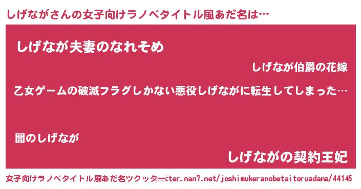 しげながさんの女子向けラノベタイトル風あだ名は… 『乙女ゲームの破滅フラグしかない悪役しげながに転生してしまった…』『しげなが夫妻のなれそめ』『しげながの契約王妃』 ツクッター #女子向けラノベタイトル風あだ名ツクッター http://tkutter.nan7.net/joshimukeranobetaitoruadana/44145/