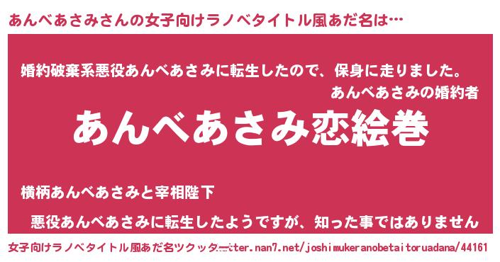 | 男性向けラノベタイトル風あだ名 | 『おまえをオタクにしてやるから、俺をあんべあさみにしてくれ! 』 |
