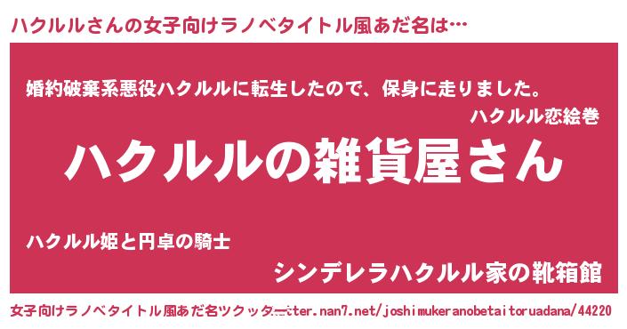 | 男性向けラノベタイトル風あだ名 | 『やはりハクルルの青春ラブコメはまちがっている 』 |