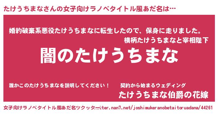 | 男性向けラノベタイトル風あだ名 | 『Re:たけうちまなから始める異世界生活』 |