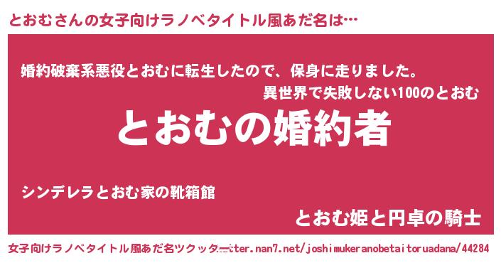 とおむさんの女子向けラノベタイトル風あだ名は… 『とおむの婚約者』『婚約破棄系悪役とおむに転生したので、保身に走りました。』『とおむ姫と円卓の騎士』 ツクッター #女子向けラノベタイトル風あだ名ツクッター http://tkutter.nan7.net/joshimukeranobetaitoruadana/44284/