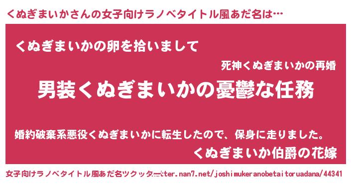 | 男性向けラノベタイトル風あだ名 | 『うちのくぬぎまいかが世界を掌握している!』 |
