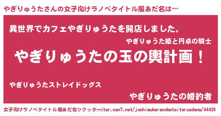 | 男性向けラノベタイトル風あだ名 | 『やぎりゅうた~年齢イコール彼女いない歴の魔法使い~』 |