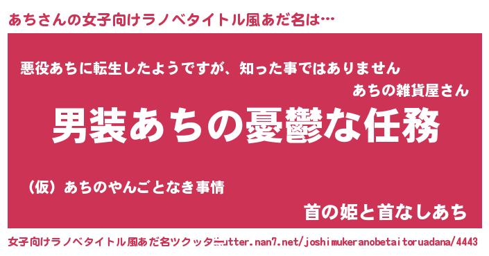 | 男性向けラノベタイトル風あだ名 | 『うちのあちが世界を掌握している!』 |