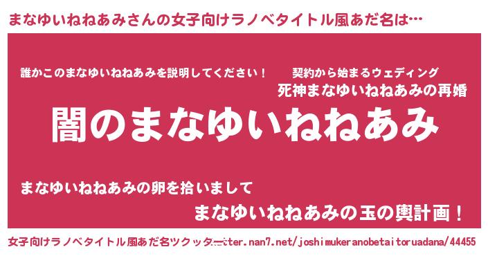 | 男性向けラノベタイトル風あだ名 | 『Re:まなゆいねねあみから始める異世界生活』 |