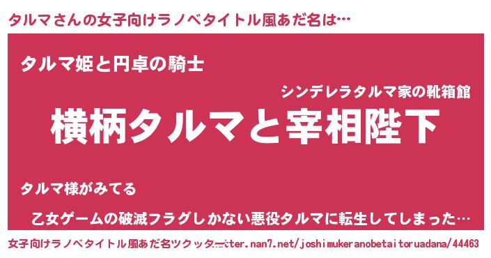 | 男性向けラノベタイトル風あだ名 | 『タルマに滅ぼされるだけの簡単なお仕事です』 |