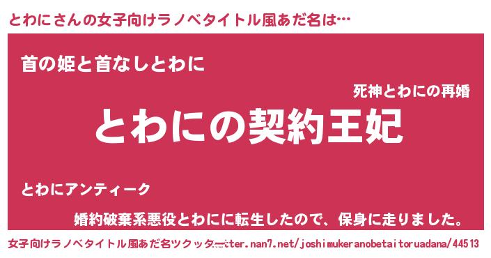 | 意味不明あだ名 | 『永久保存とわに』『しいたけ科とわに属』 |