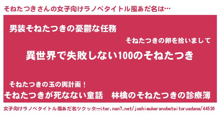 | 男性向けラノベタイトル風あだ名 | 『そねたつきという概念が存在しない退屈な世界 』 |