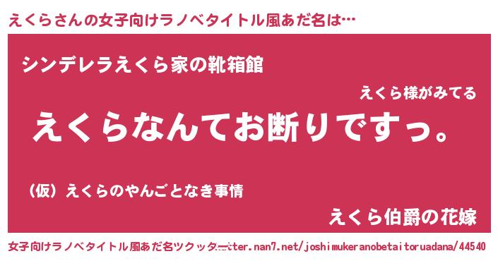 えくらさんの女子向けラノベタイトル風あだ名は… 『えくらなんてお断りですっ。』『シンデレラえくら家の靴箱館』『えくら伯爵の花嫁』 ツクッター #女子向けラノベタイトル風あだ名ツクッター http://tkutter.nan7.net/joshimukeranobetaitoruadana/44540/