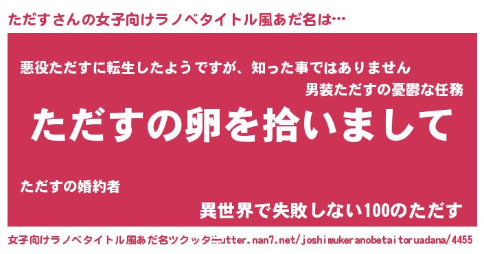 | 男性向けラノベタイトル風あだ名 | 『ただすの嫁は女の子じゃないと思った?』 |