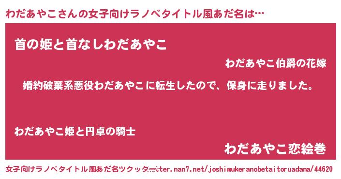 | 男性向けラノベタイトル風あだ名 | 『転生したらわだあやこだった件』 |