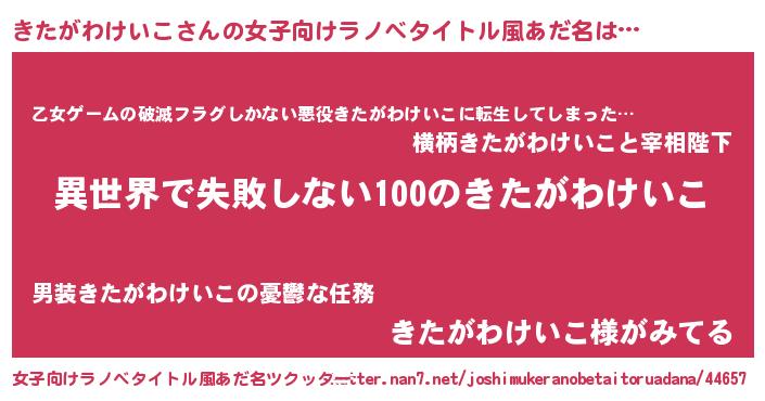 | 男性向けラノベタイトル風あだ名 | 『きたがわけいこという概念が存在しない退屈な世界 』 |