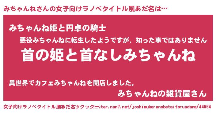| 男性向けラノベタイトル風あだ名 | 『はたらくみちゃんねさま!』 |