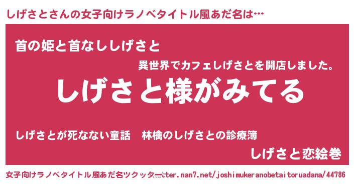 | 男性向けラノベタイトル風あだ名 | 『しげさとの嫁は女の子じゃないと思った?』 |