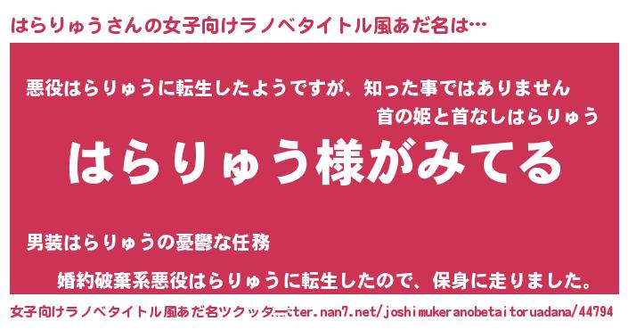 | 男性向けラノベタイトル風あだ名 | 『はらりゅうの嫁は女の子じゃないと思った?』 |