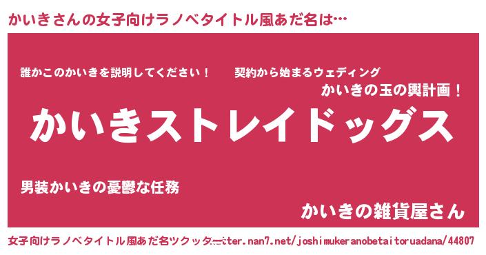 かいきさんの女子向けラノベタイトル風あだ名は… 『かいきストレイドッグス』『誰かこのかいきを説明してください! ~契約から始まるウェディング~』『かいきの雑貨屋さん』 ツクッター #女子向けラノベタイトル風あだ名ツクッター http://tkutter.nan7.net/joshimukeranobetaitoruadana/44807/