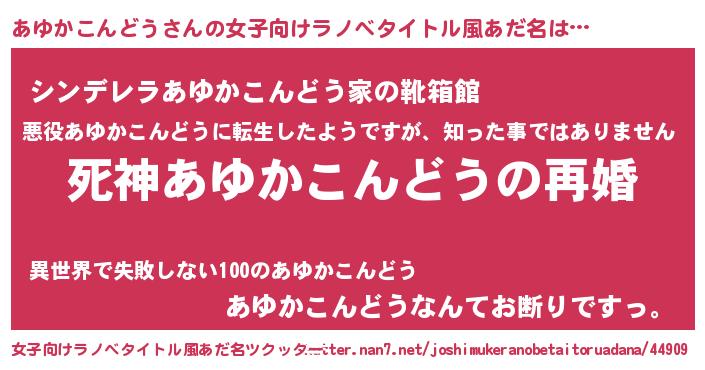 あゆかこんどうさんの女子向けラノベタイトル風あだ名は… 『死神あゆかこんどうの再婚』『シンデレラあゆかこんどう家の靴箱館』『あゆかこんどうなんてお断りですっ。』 ツクッター #女子向けラノベタイトル風あだ名ツクッター http://tkutter.nan7.net/joshimukeranobetaitoruadana/44909/